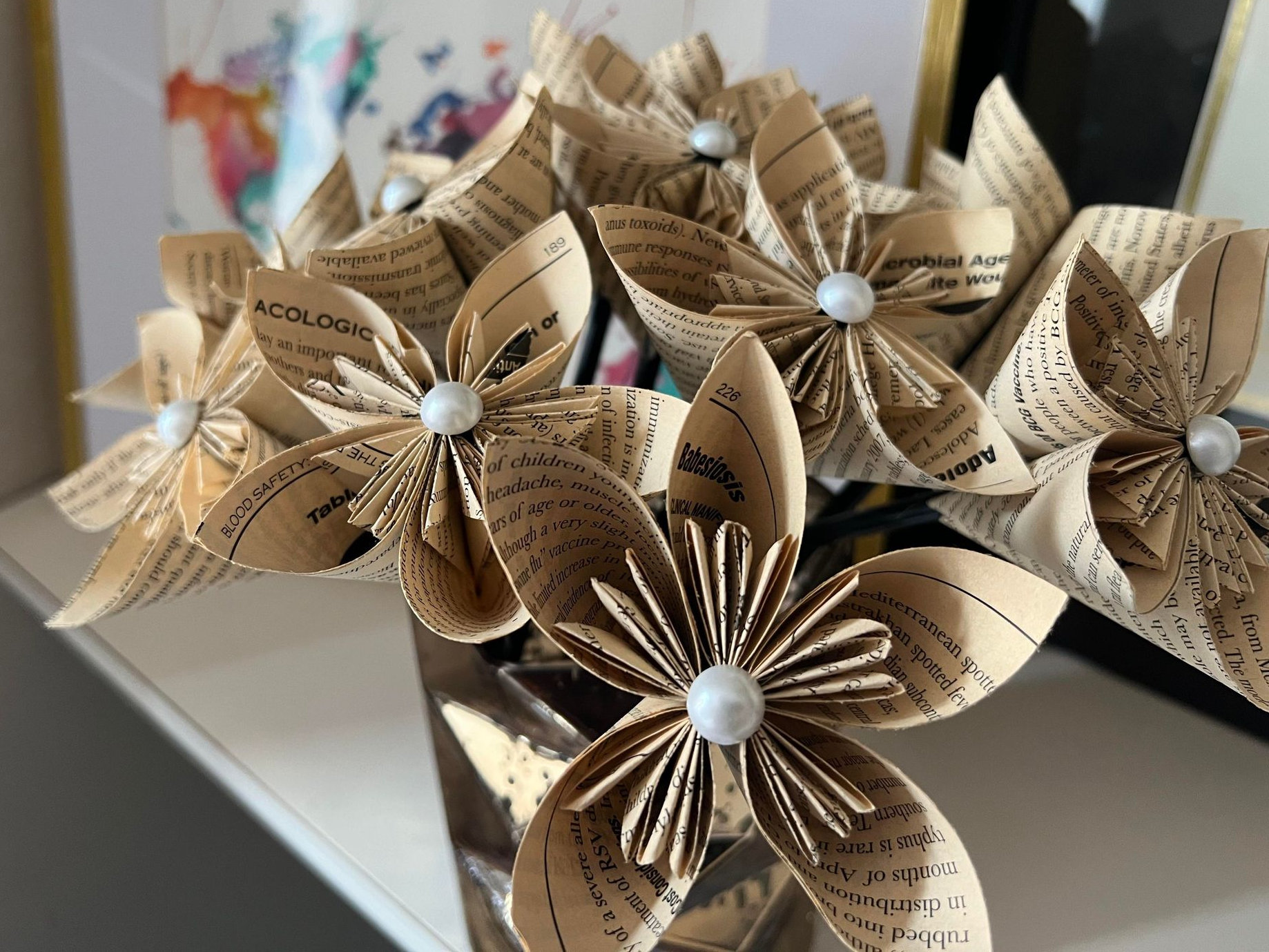 Liz transforms classic medical literature into display-worthy pieces of art. Doctors pour their heart and soul into their callings, and deserve art that connects with that calling. Her specialty is making Red Book paper flowers, but is open to upcycling other books as well.
